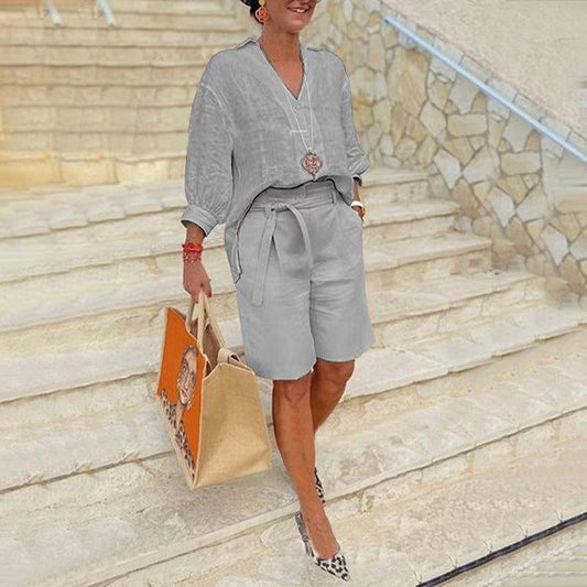 Dámský dvoudílný jednobarevný top s výstřihem do V + šortky