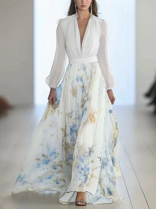 Elegantní dlouhé šaty s květinovým potiskem, výstřihem do V a dlouhými rukávy