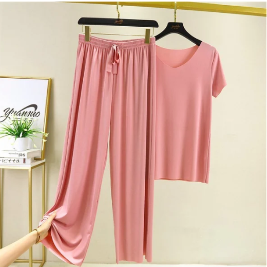 Měkké pohodlné ledové hedvábné tričko s krátkým rukávem Dvoudílná sada Volné široké kalhoty