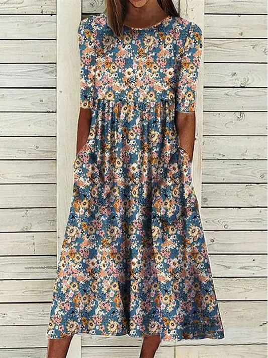 Midi šaty s kulatým výstřihem a květinovým potiskem