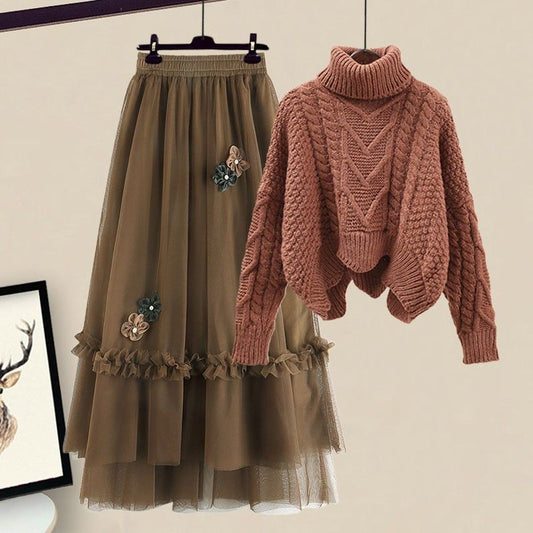 2023 Nový model zahalující zeštíhlující svetr + pletená dvoudílná sukně v pase