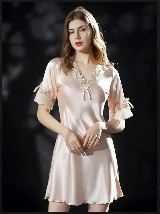 【Dobírka】Dámská krajková noční košile Ice Silk s krátkým rukávem