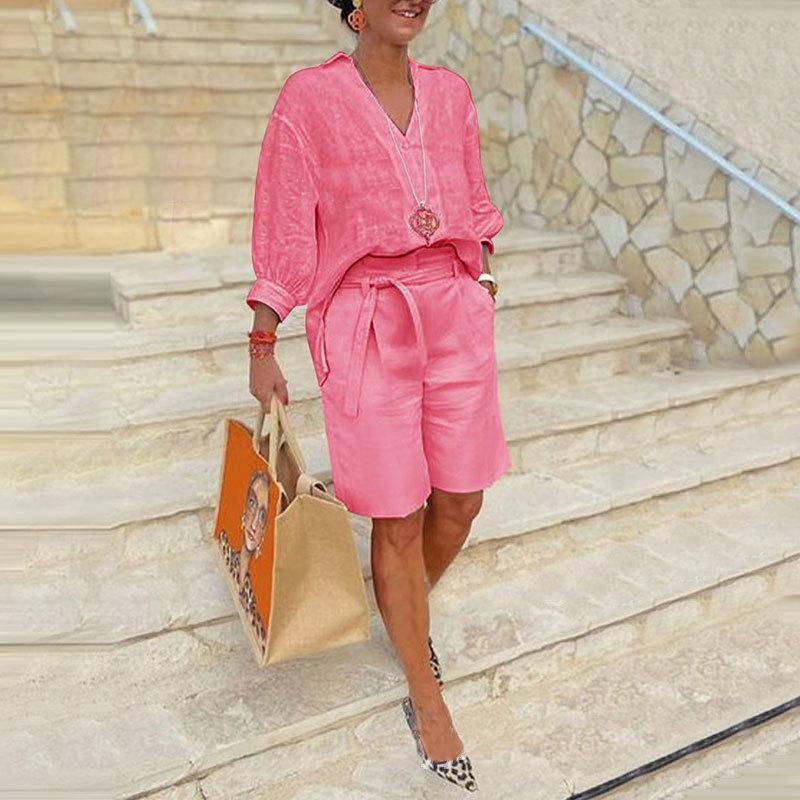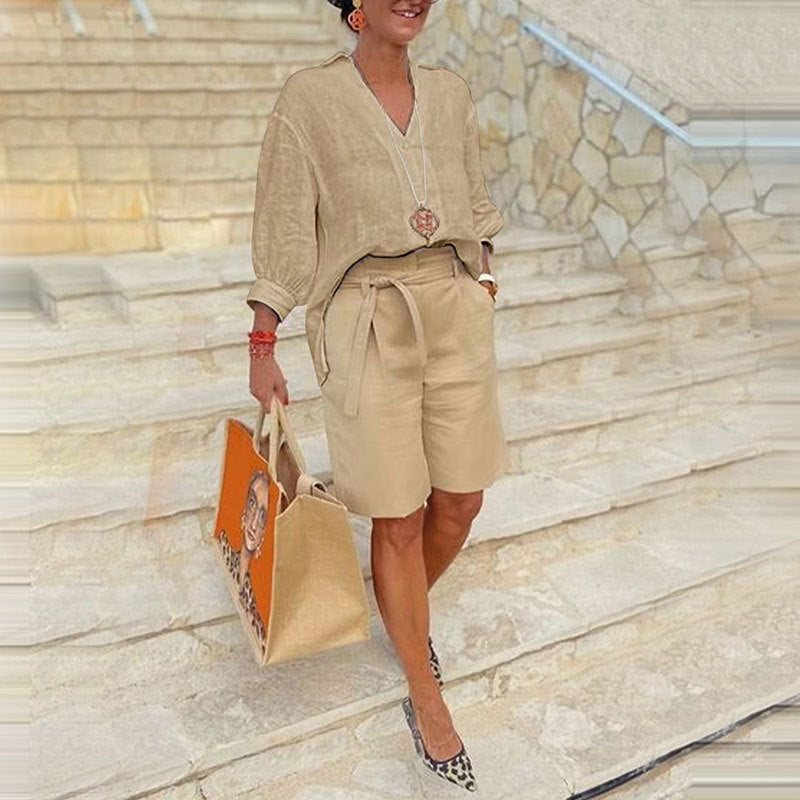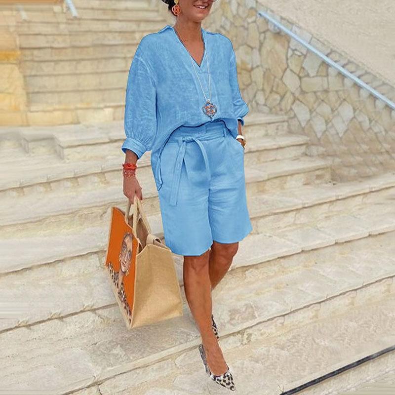 Dámský dvoudílný jednobarevný top s výstřihem do V + šortky