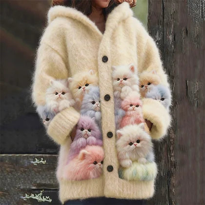 Roztomilý, měkký a barevný kardigan s kapucí a potiskem kočky