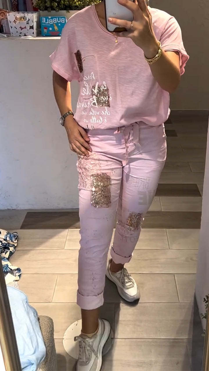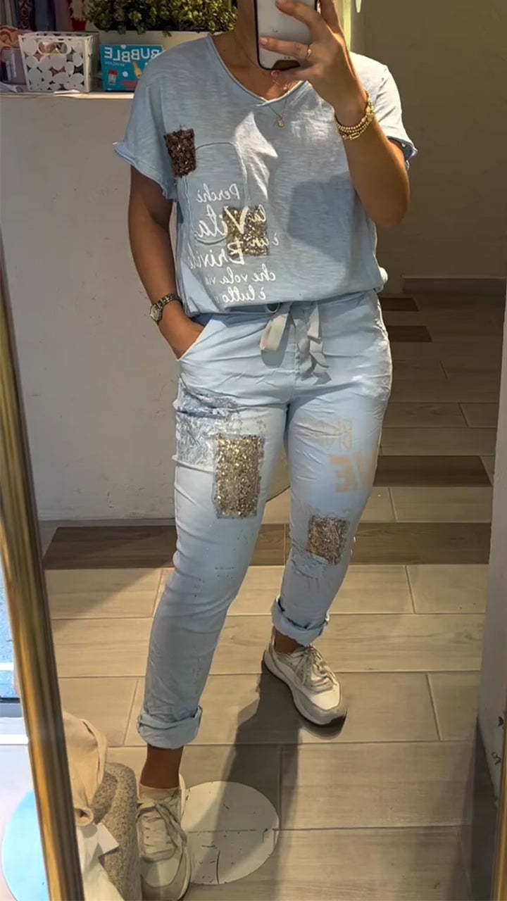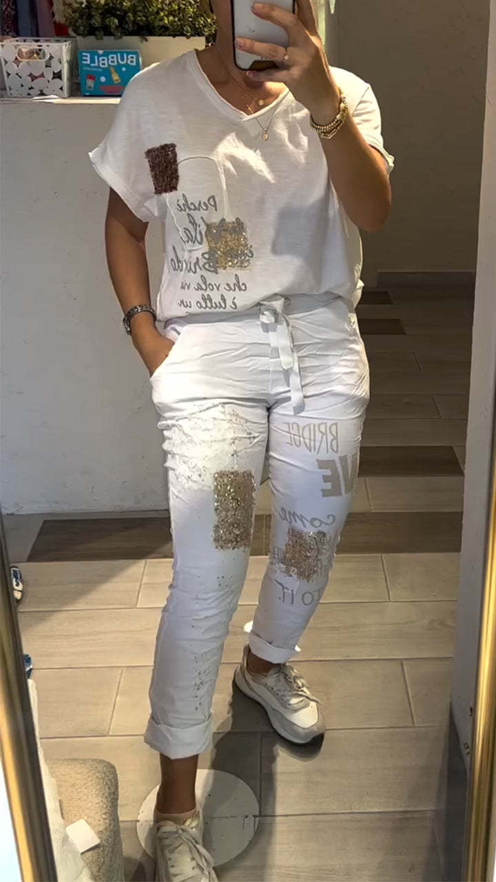 Dámský neformální set topu a kalhot s výstřihem do V s potiskem zlatého razítka