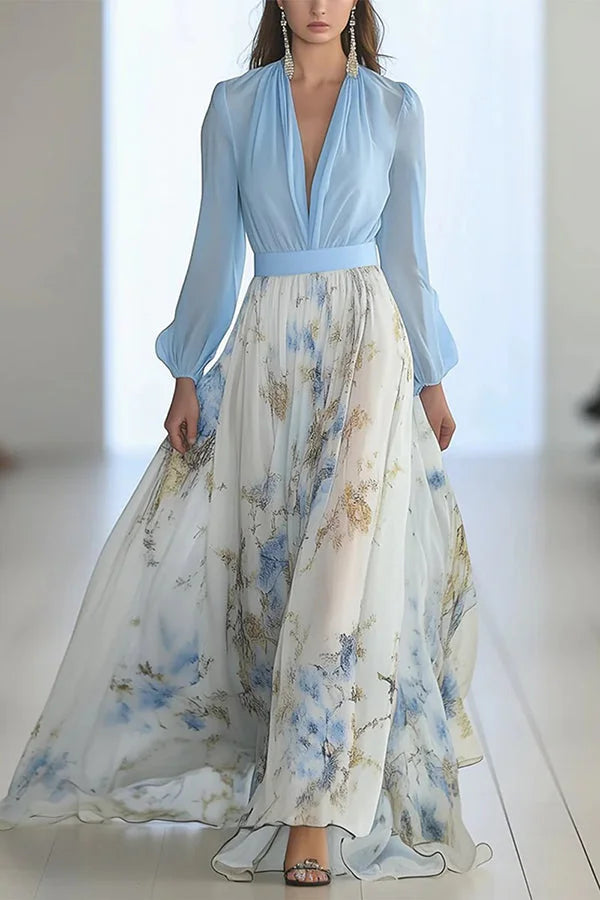 Elegantní dlouhé šaty s květinovým potiskem, výstřihem do V a dlouhými rukávy