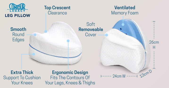 Polštář na nohy Contour Legacy je ergonomicky navržený zkosený polštář na nohy, který se přirozeně přizpůsobí konturám vašich nohou, kolen a stehen, aby pomohl vyrovnat vaši páteř a pomohl zmírnit nepohodlí. Polštář na nohy Contour Legacy stabilizuje vaše tělo, aby se zabránilo kroucení dolní části zad a rotaci kyčelního kloubu pro pohodlnější noční spánek.
