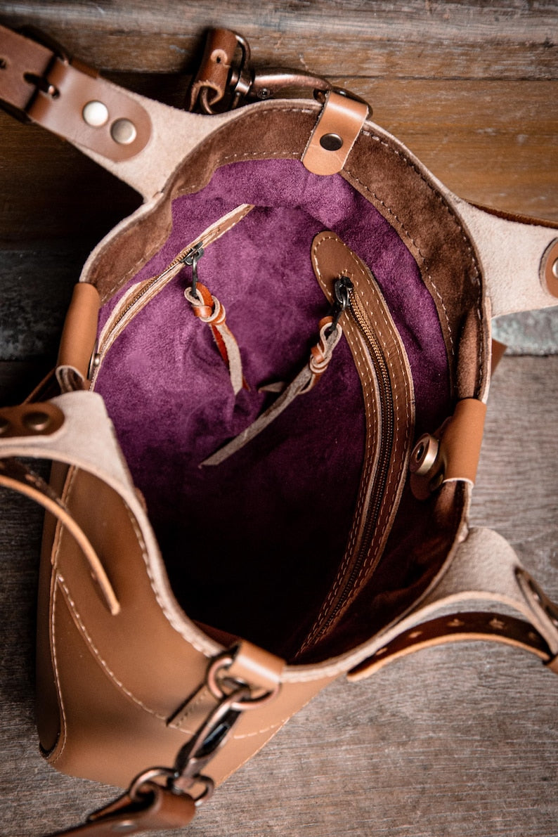Taška je vyrobena z celozrnné kůže v barvě moka (velmi odolná vůči nečistotám a povětrnostním vlivům).