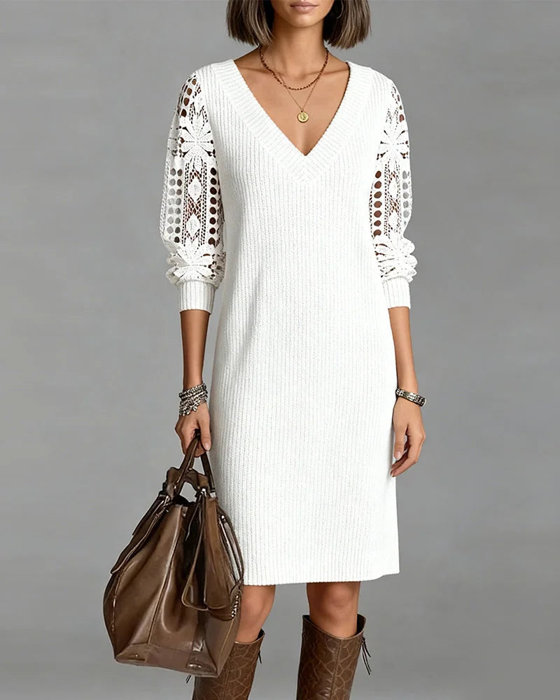 Krajkové šaty s výstřihem do V a dlouhým rukávem.