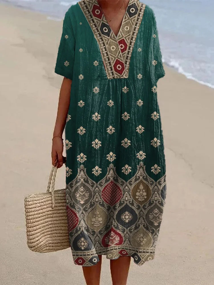 Dámské etnické bohémské květinové šaty ze směsi lnu