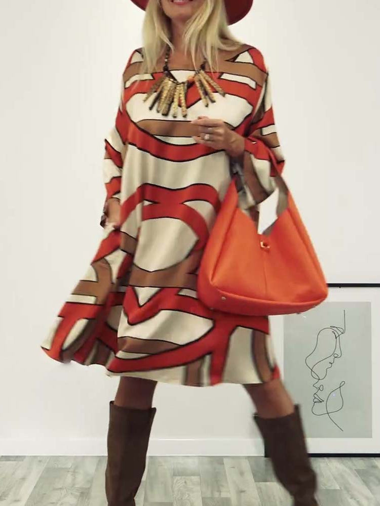Volné šaty s potištěným kulatým výstřihem a dlouhými rukávy