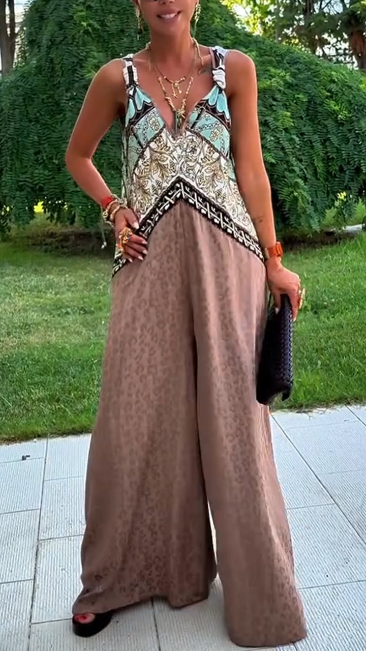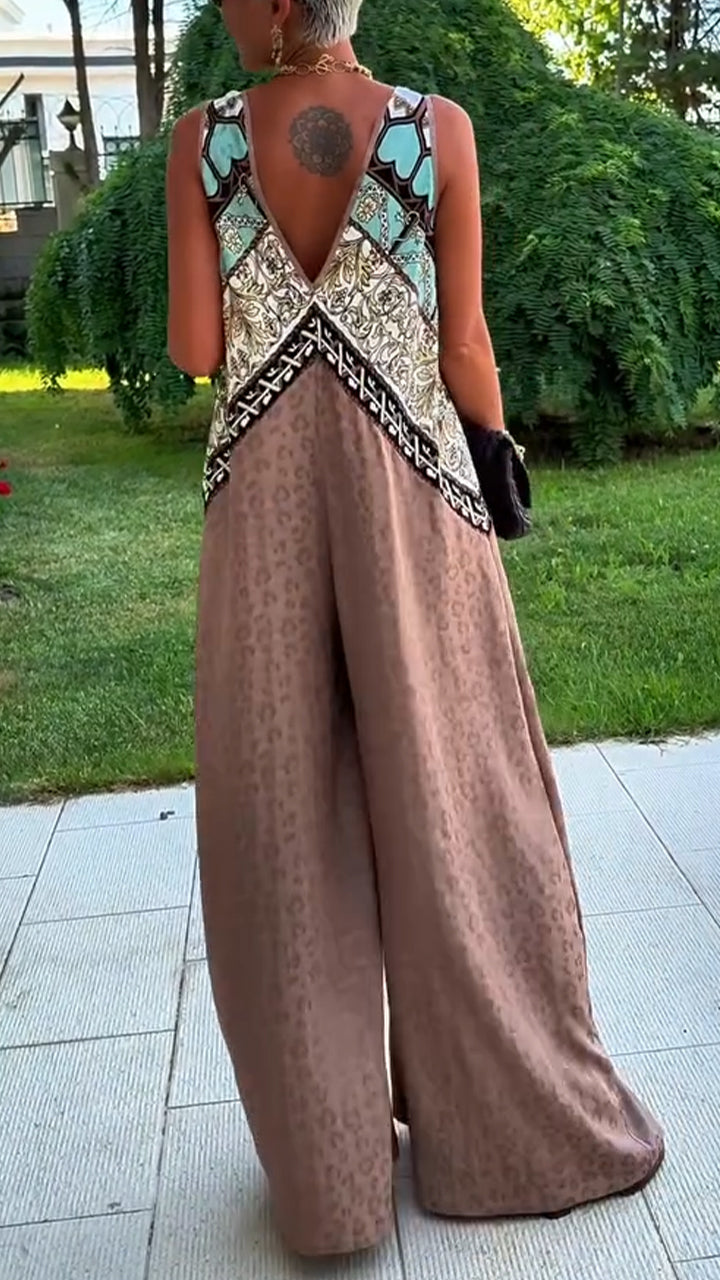 Dámský volný ležérní overal s výstřihem do V a potiskem patchworku